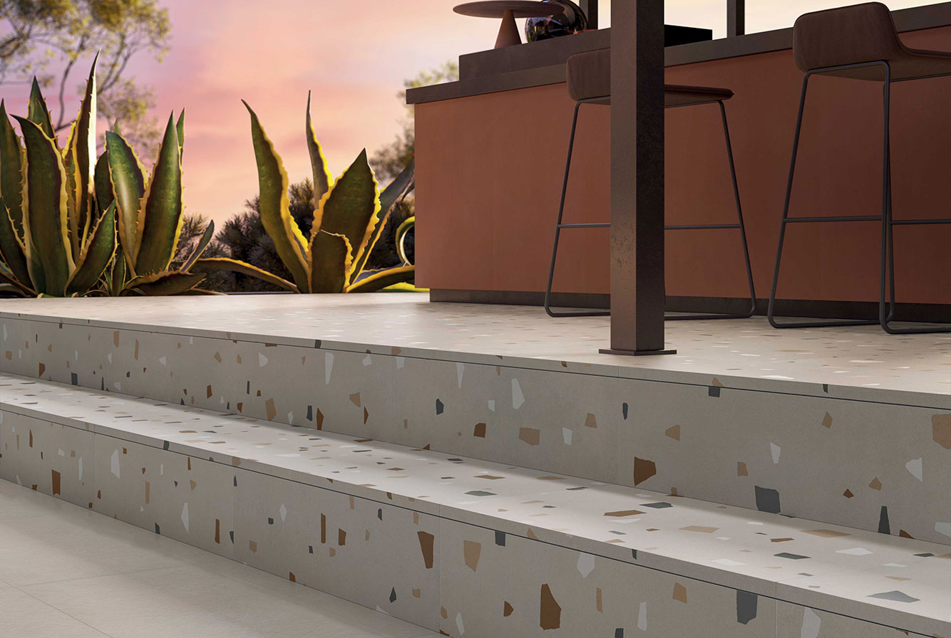 Одиннадцать натуральных оттенков базовой плитки, соответствующих новым эстетическим канонам дизайна интерьеров, обогащаются многоцветными фрагментами декорированного керамогранита Coccio в стиле минималистичного терраццо с деликатным отражающим эффектом, полностью интегрированными в текстуру плитки.