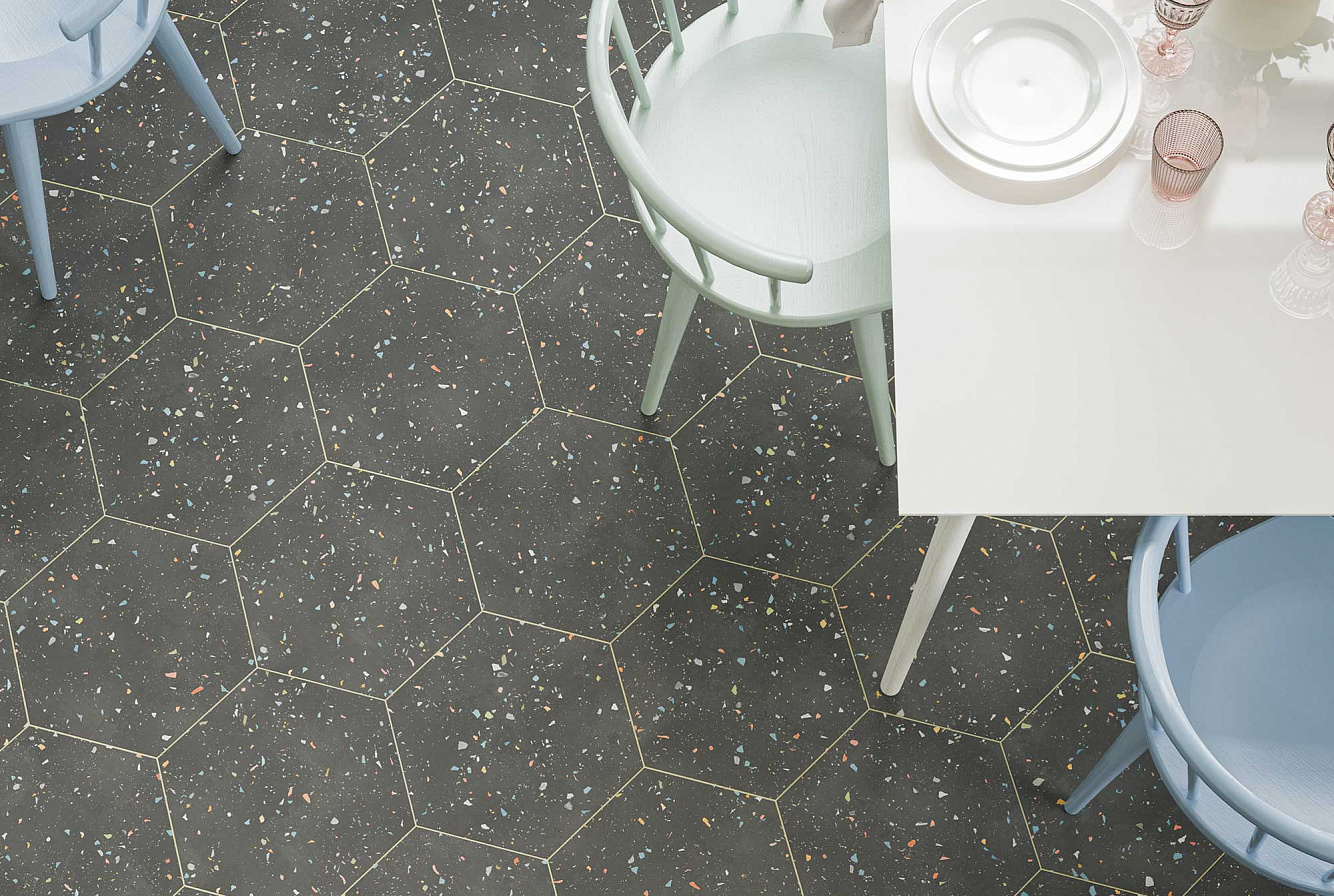Коллекция керамического гранита DNA Tiles TERRAZZO производится в шестиугольном формате (гексагоны) 32x37 см и имитирует семь различных видов терраццо. Спокойные текстуры White, Graphite сочетаются с авангардными White Colours, Graphite Colours и яркими Grey, Earth и Teal.